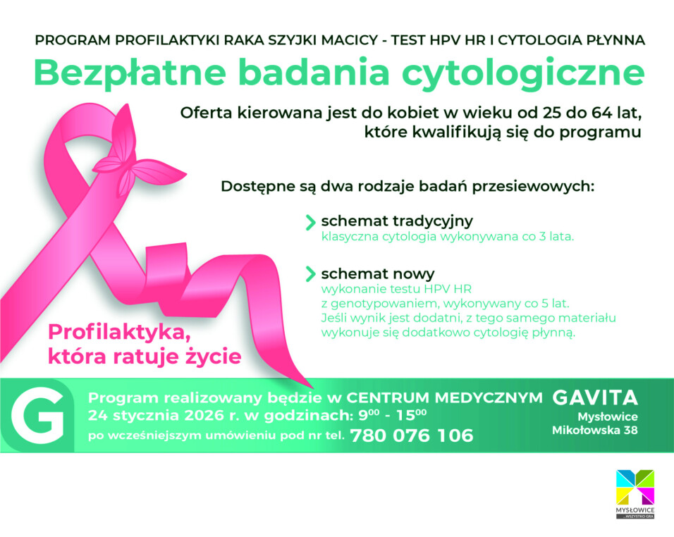 Serdecznie zapraszamy do skorzystania z możliwości przeprowadzenia bezpłatnych badań w ramach programu „Profilaktyka raka szyjki macicy” finansowanego ze środków z NFZ w jednej z mysłowickich placówek zdrowotnych w dniu 24 stycznia 2026 r. (po wcześniejszym umówieniu telefonicznym).