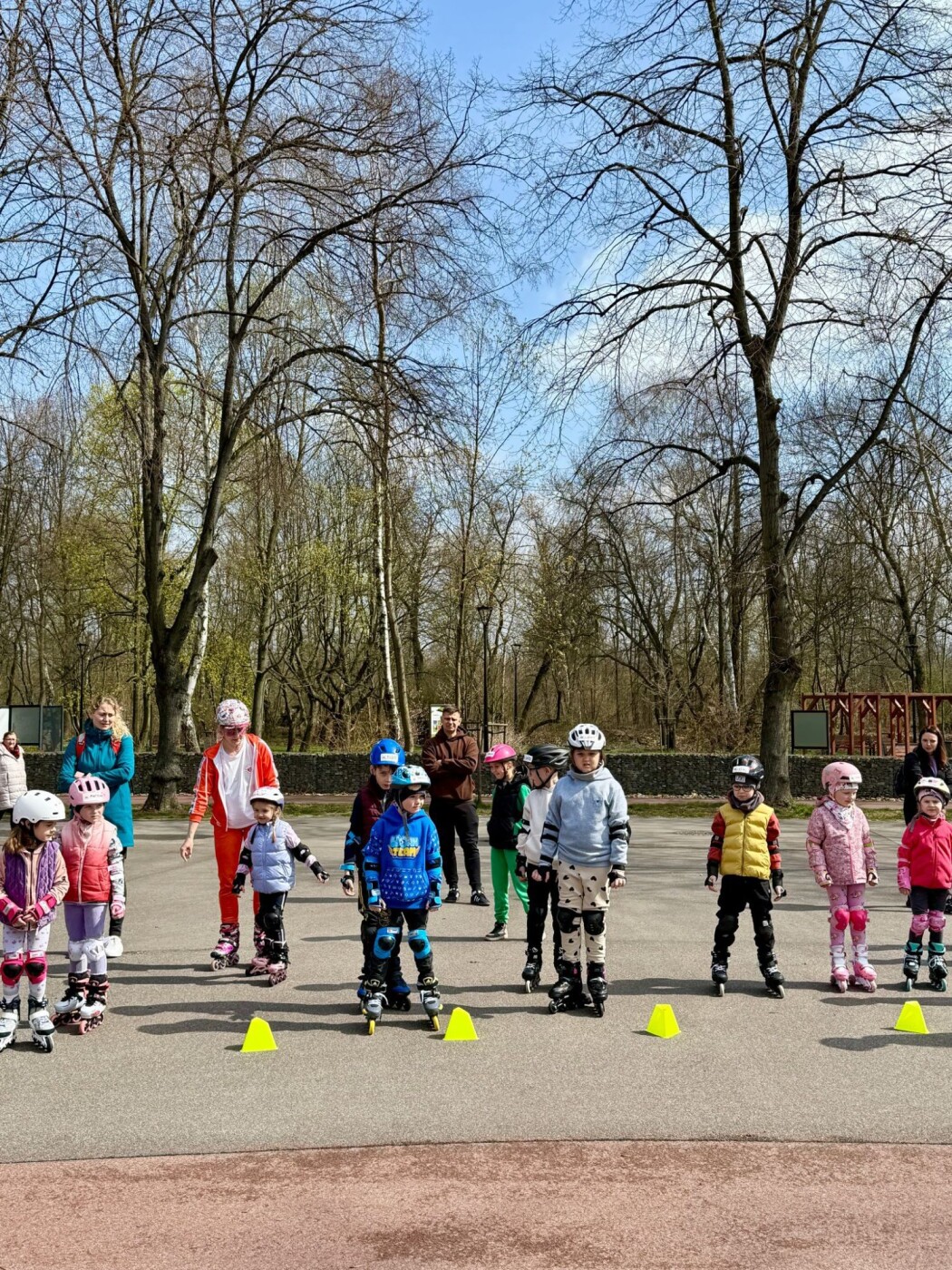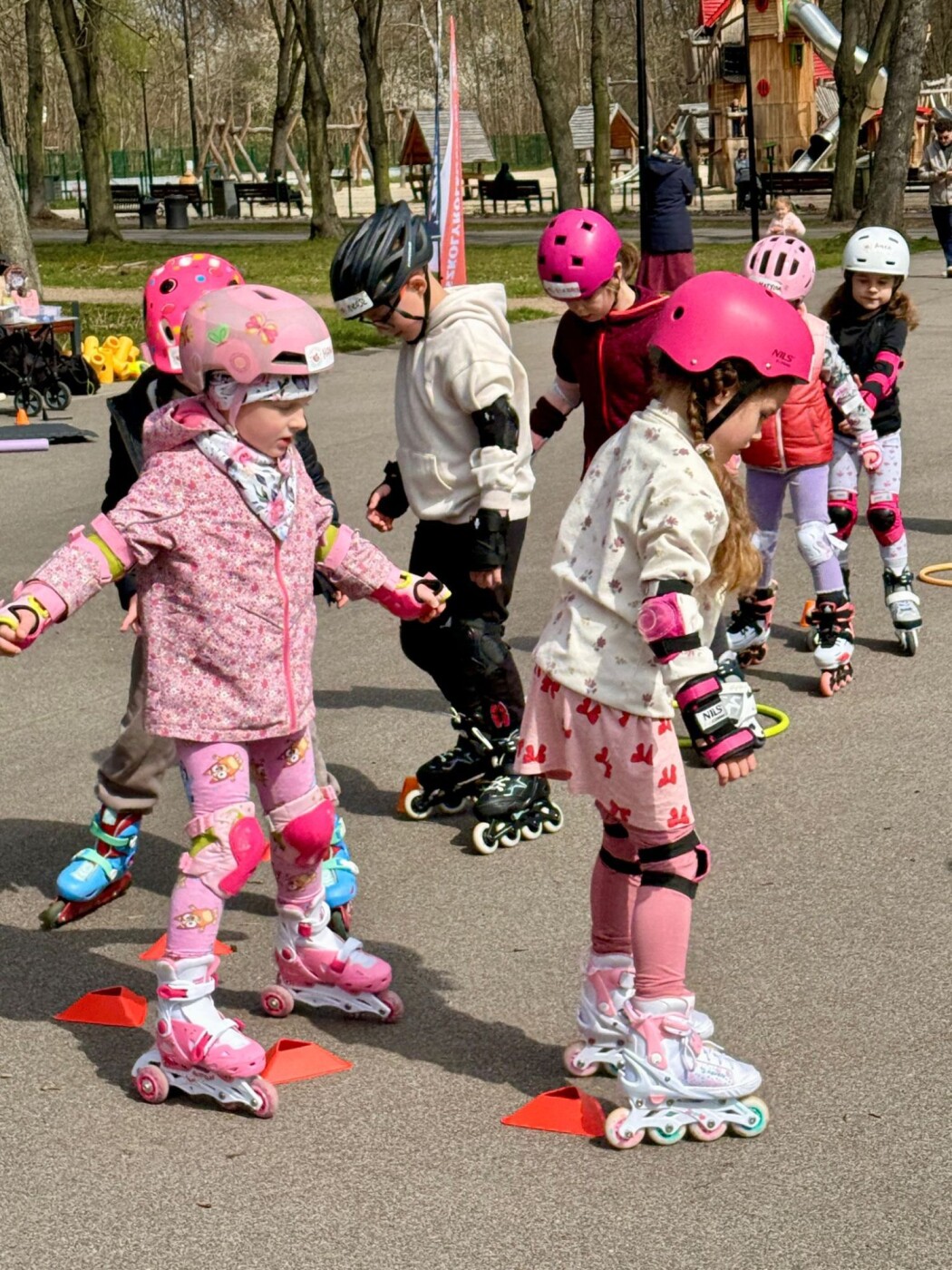 Dzieci w kaskach i ochraniaczach na rolkach stoją na placu w parku, przed nimi ustawione są żółte pachołki.