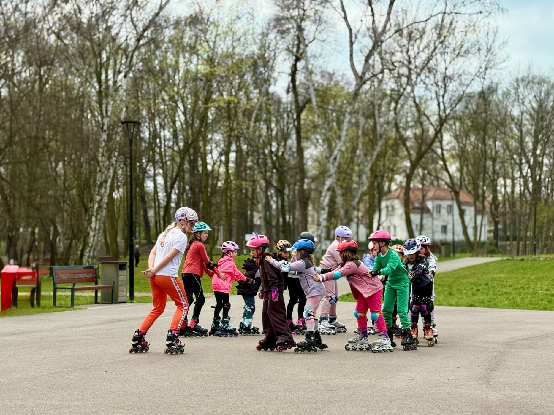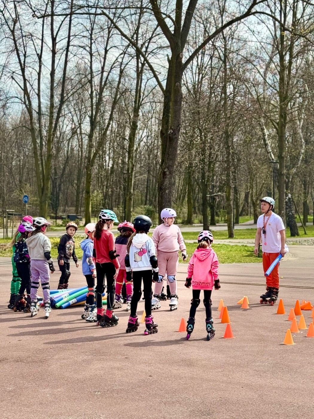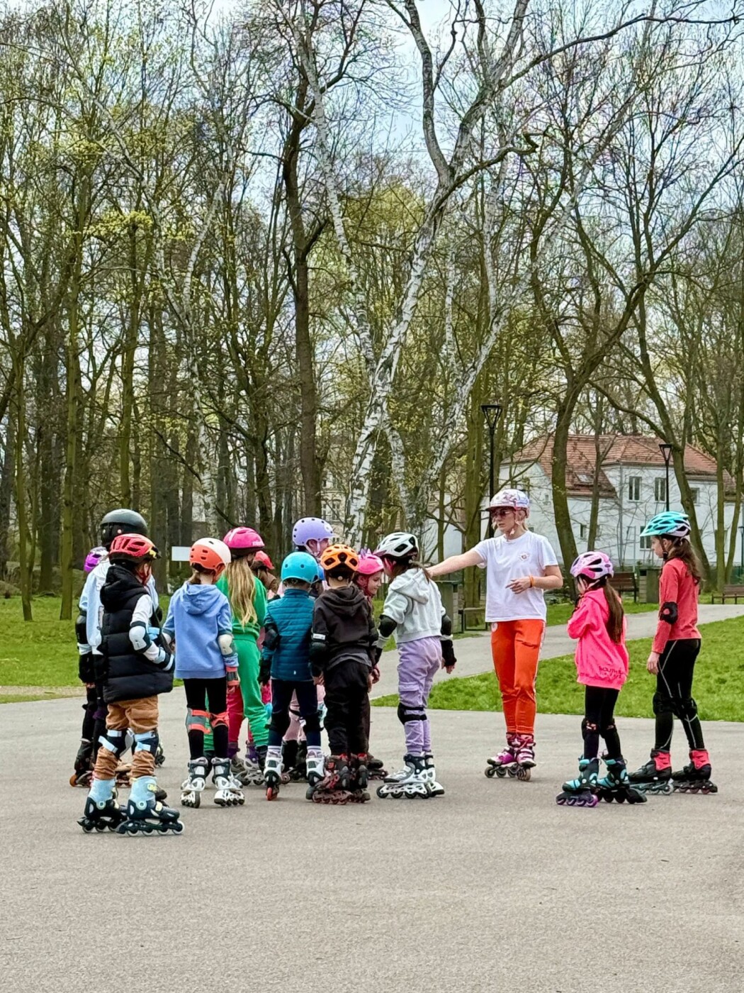Grupa dzieci w kaskach i na rolkach zebrana wokół instruktorki na ścieżce w parku.