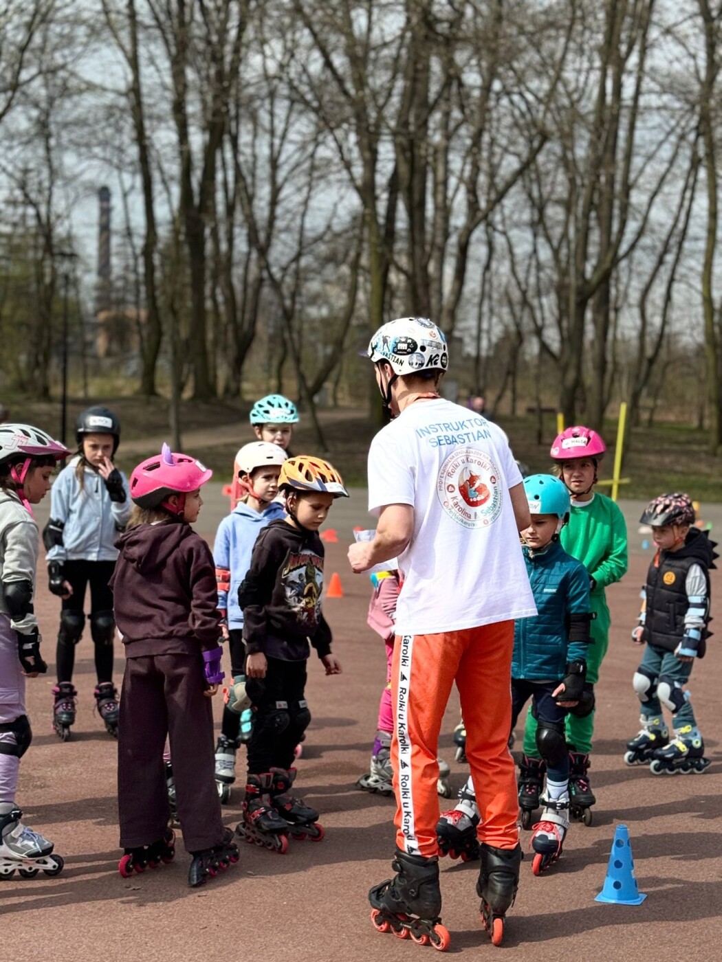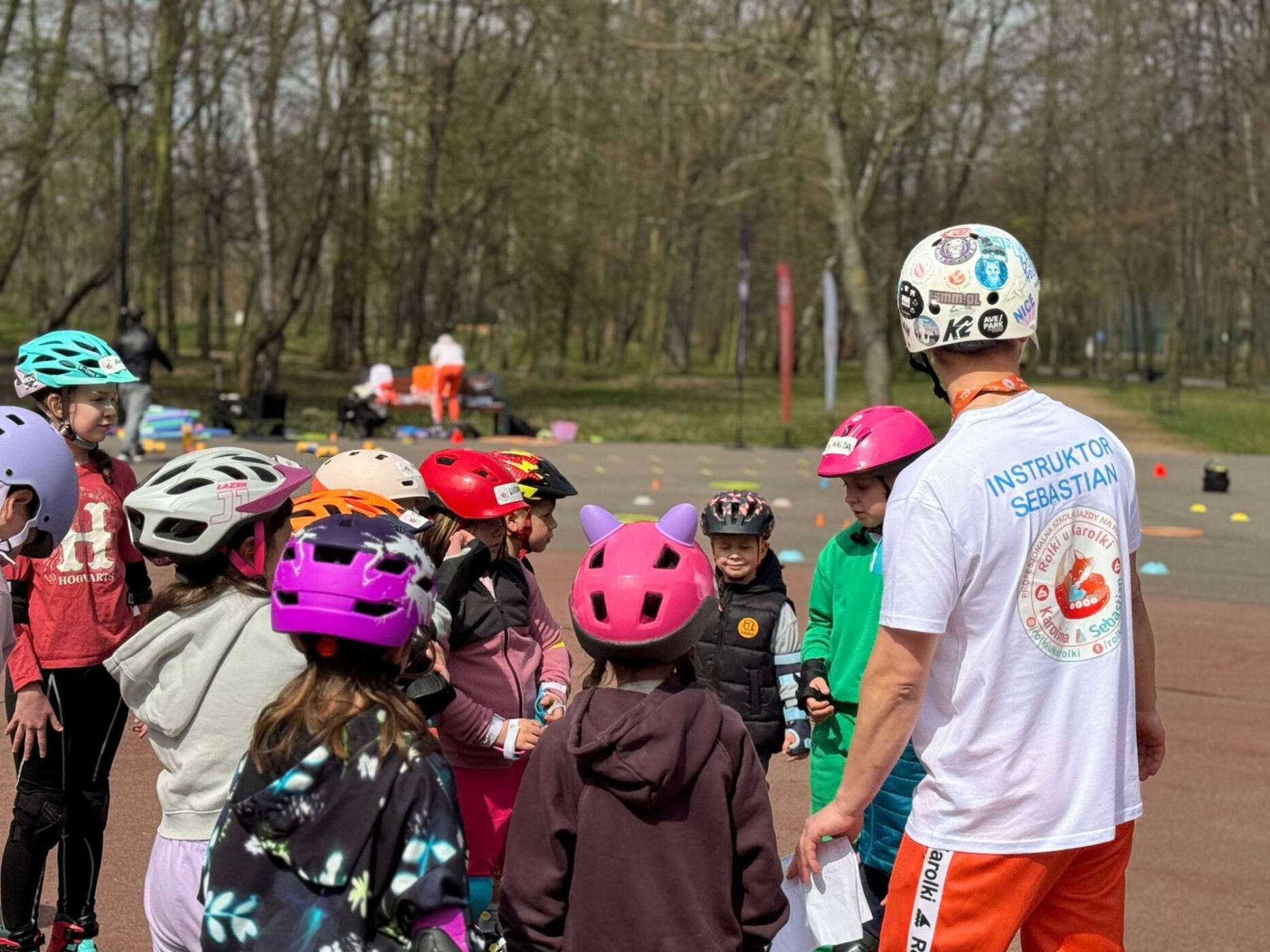 Instruktor Sebastian stoi przed grupą dzieci w kaskach ochronnych podczas zajęć na placu w parku.