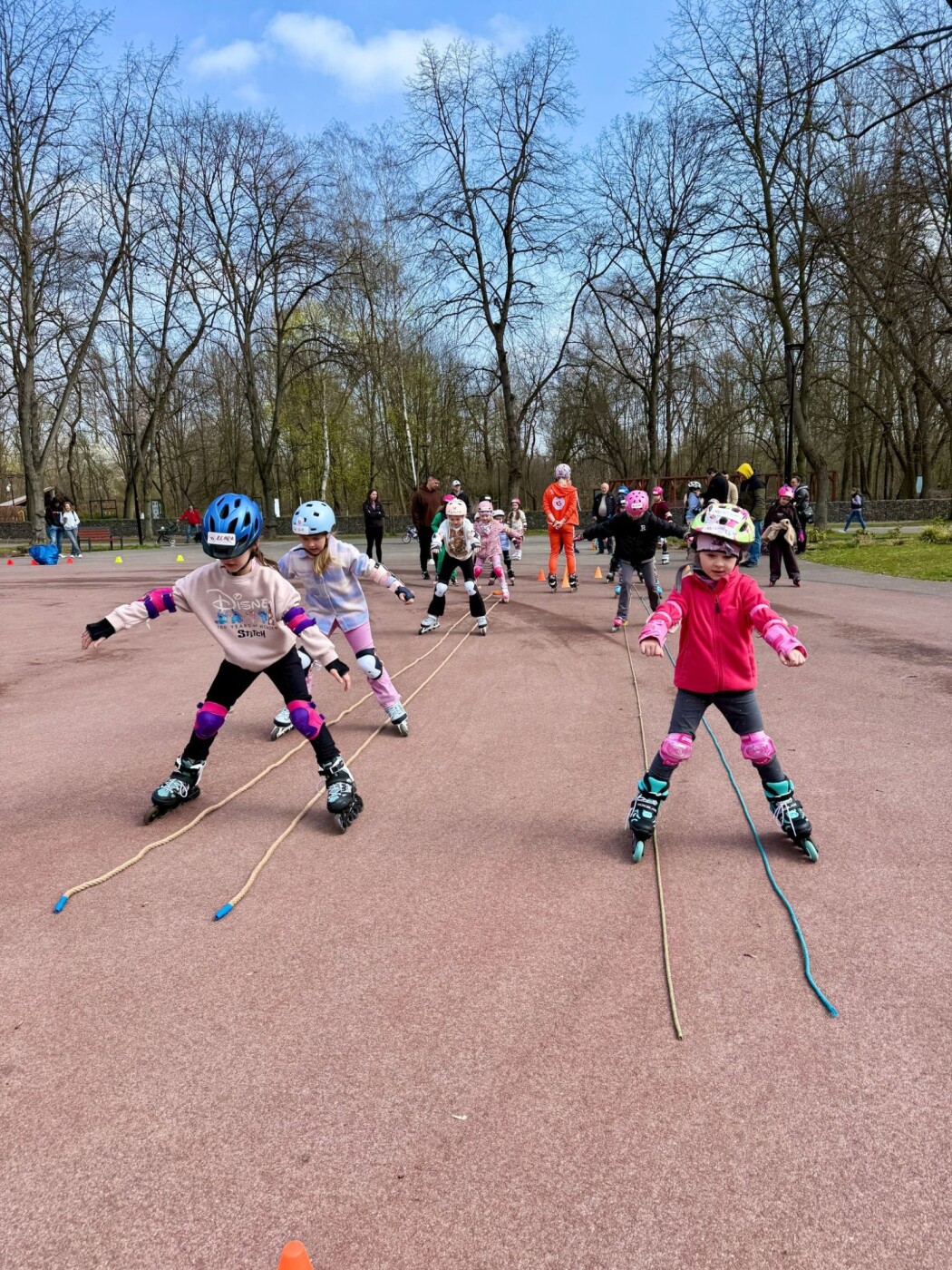 Dzieci w kaskach i ochraniaczach uczą się jazdy na rolkach w parku, przejeżdżając nad rozłożonymi na ziemi linami.