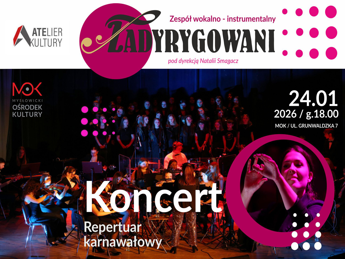 Mysłowicki Ośrodek Kultury zaprasza na koncert zespołu Zadyrygowani, który odbędzie się 24 stycznia 2026 roku w siedzibie MOK przy ul. Grunwaldzkiej 7. Wstęp na wydarzenie wynosi 80 zł, a bilety są dostępne w kasach MOK oraz na portalu KupBilecik.