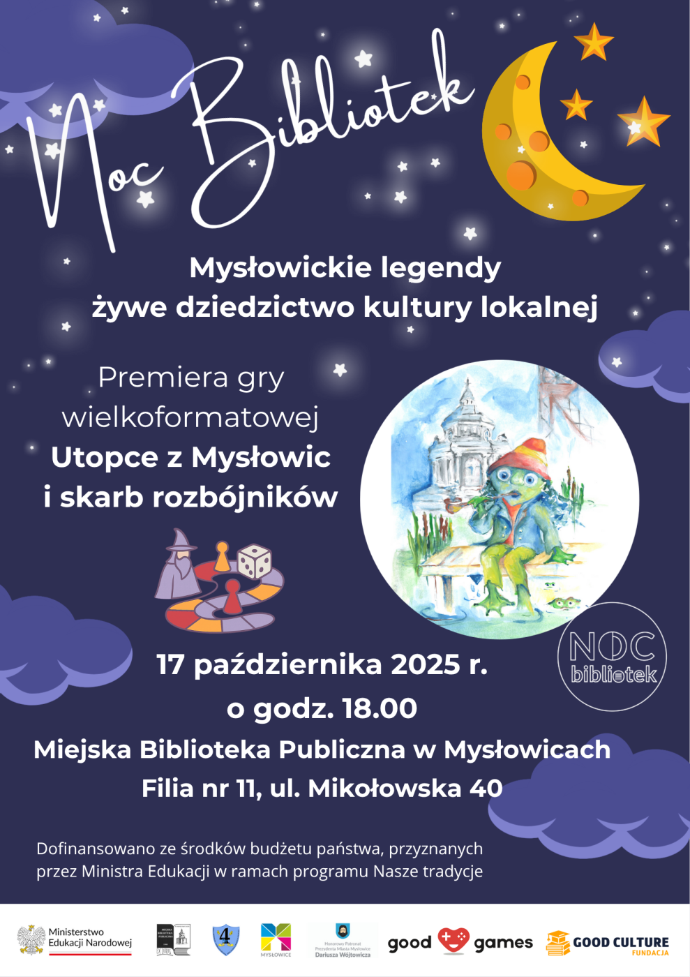 Noc Bibliotek to coroczna, ogólnopolska akcja, która ma na celu promowanie bibliotek jako miejsc otwartych na kulturę, wiedzę i twórczość. Z każdym rokiem Noc Bibliotek zyskuje coraz większą popularność, angażując tysiące czytelników i entuzjastów literatury w całym kraju. To wydarzenie, które nie tylko bawi, ale również edukuje i inspiruje do odkrywania nowych pasji oraz budowania silnych więzi w społeczności lokalnej. Noc Bibliotek to nie tylko wspaniała okazja do spędzenia wieczoru w bibliotece, ale również szansa na poznanie nowych ludzi i dzielenie się wspólną pasją. To także świetny sposób, by w atmosferze radości i twórczości odkryć na nowo magię książek, które mogą towarzyszyć nam przez całe życie. Motyw przewodni tegorocznej edycji to "Do dzieła!" – odkryj więc, jak książki potrafią przenieść nas w najdalsze zakątki wyobraźni, jak łączą pokolenia i inspirują do działania! Przeżyj z nami niezapomnianą noc z książkami i grami planszowymi, których fabuła oparta jest na mysłowickich legendach!